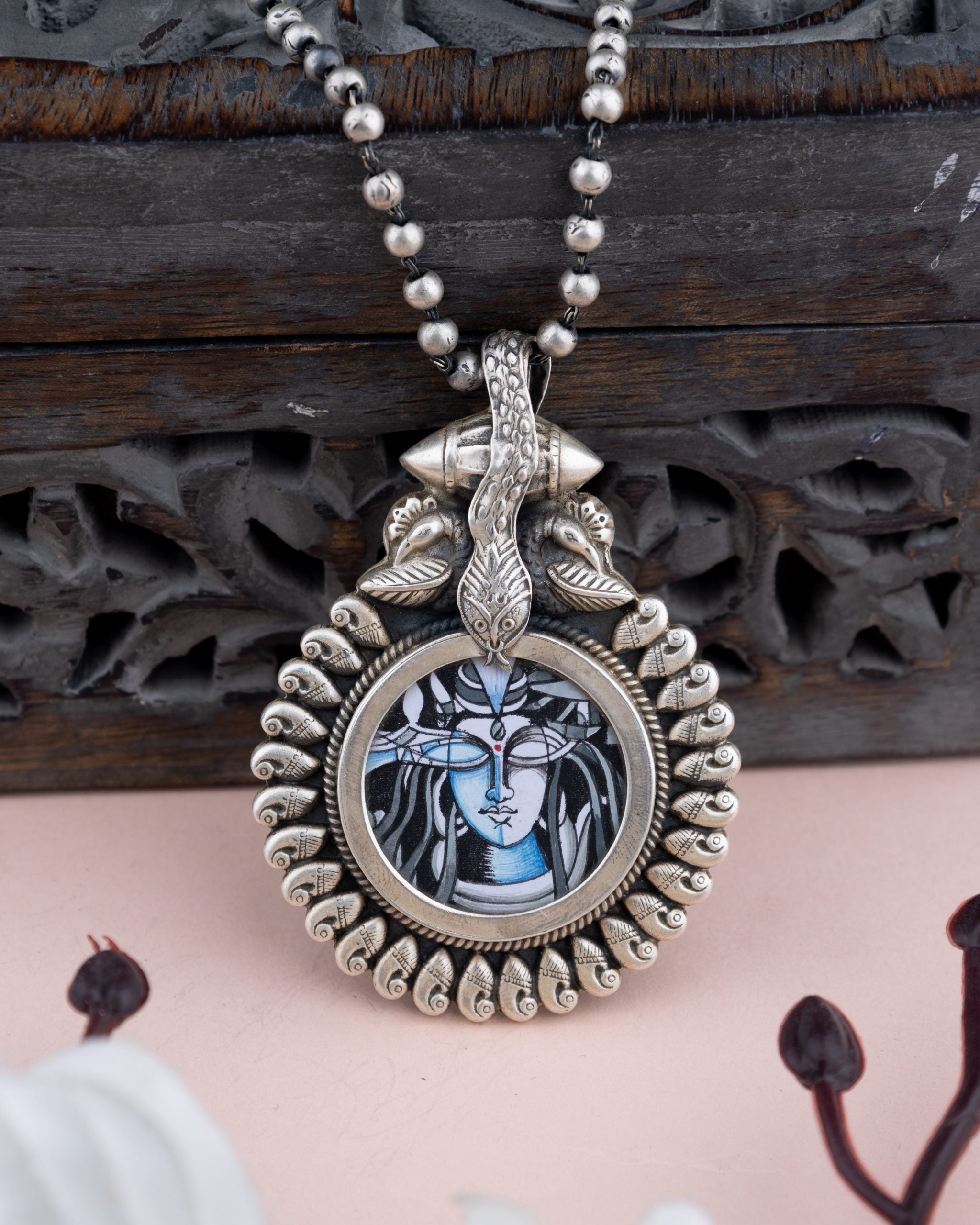 The Tattva Mahadev Hand Painted Necklace is a spiritual flex, featuring a hand painted Mahadev portrait in a detailed silver pendant, framed with intricate designs and strung on a pearl beaded chain that radiates divine energy. Inspired by the peaceful aura of a Himalayan ashram at sunrise, where chants to Lord Shiva fill the air, this piece brings a sacred vibe along with body positivity and inner peace.
