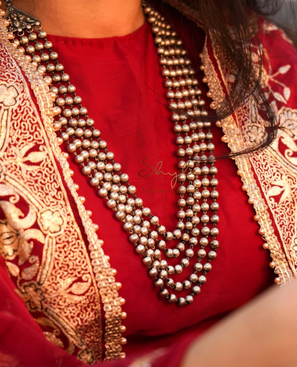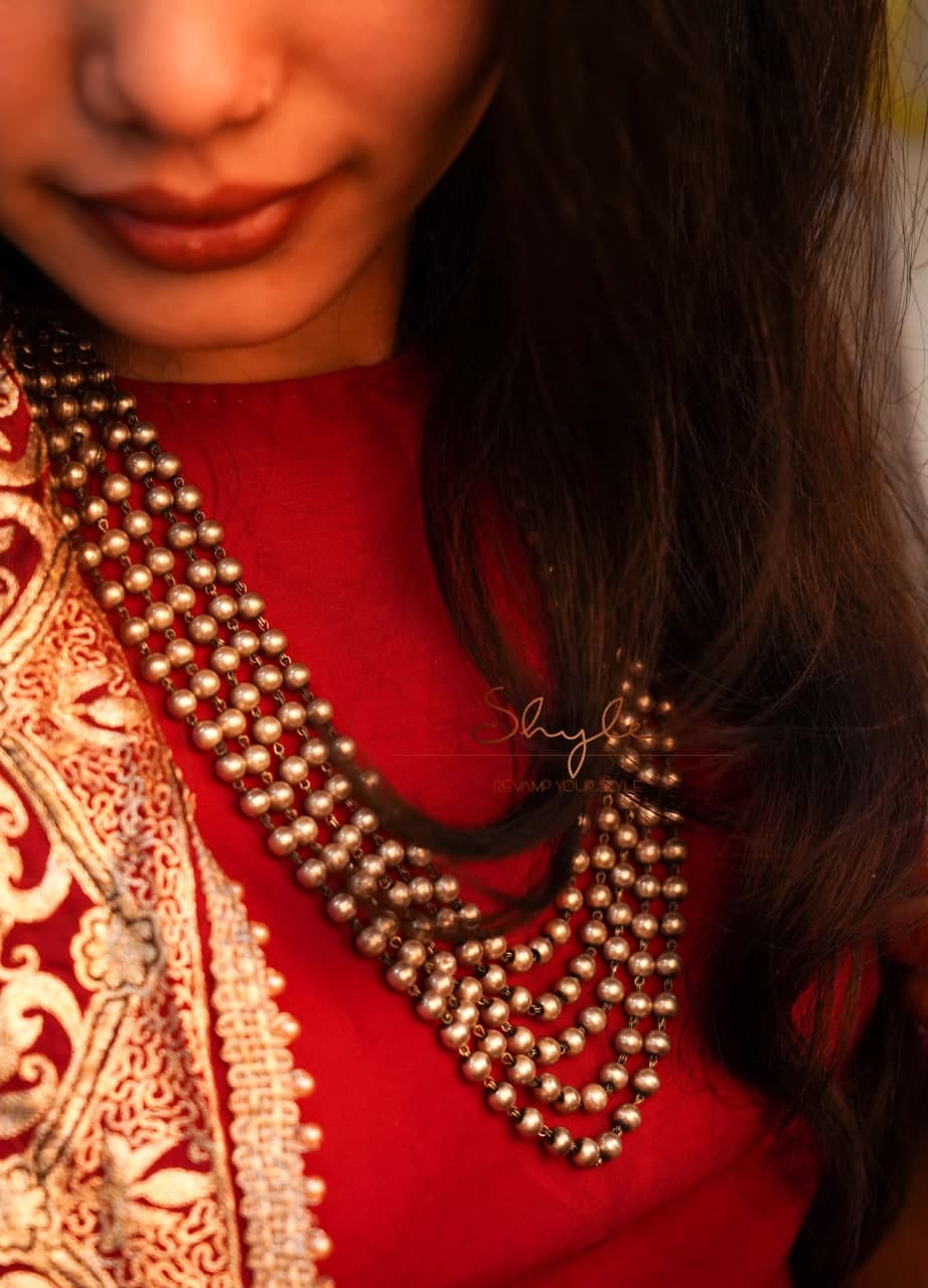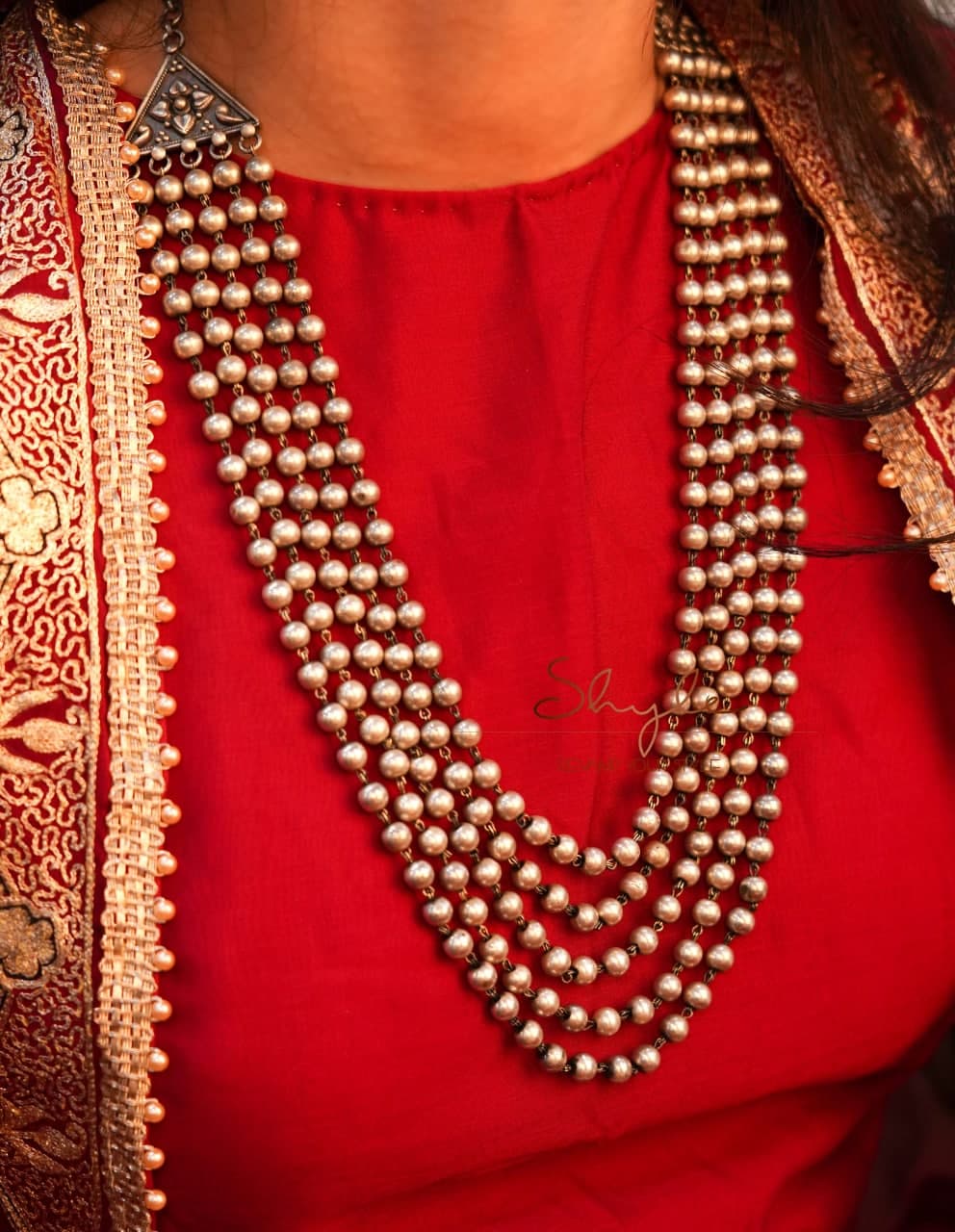 When tradition creates drama, our Tattva necklace cascades in magnificent layers of perfectly crafted silver spheres. Five graduated strands create breathtaking dimension, while tribal inspired spacer beads add cultural depth to this statement masterpiece. The polished silver balls catch light from every angle, creating a mesmerizing waterfall effect that transforms simple elegance into show stopping glamour. "Tattva" meaning essence, this necklace captures the bold spirit of layered luxury that makes every occasion unforgettable.