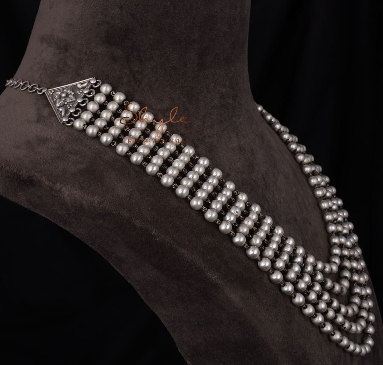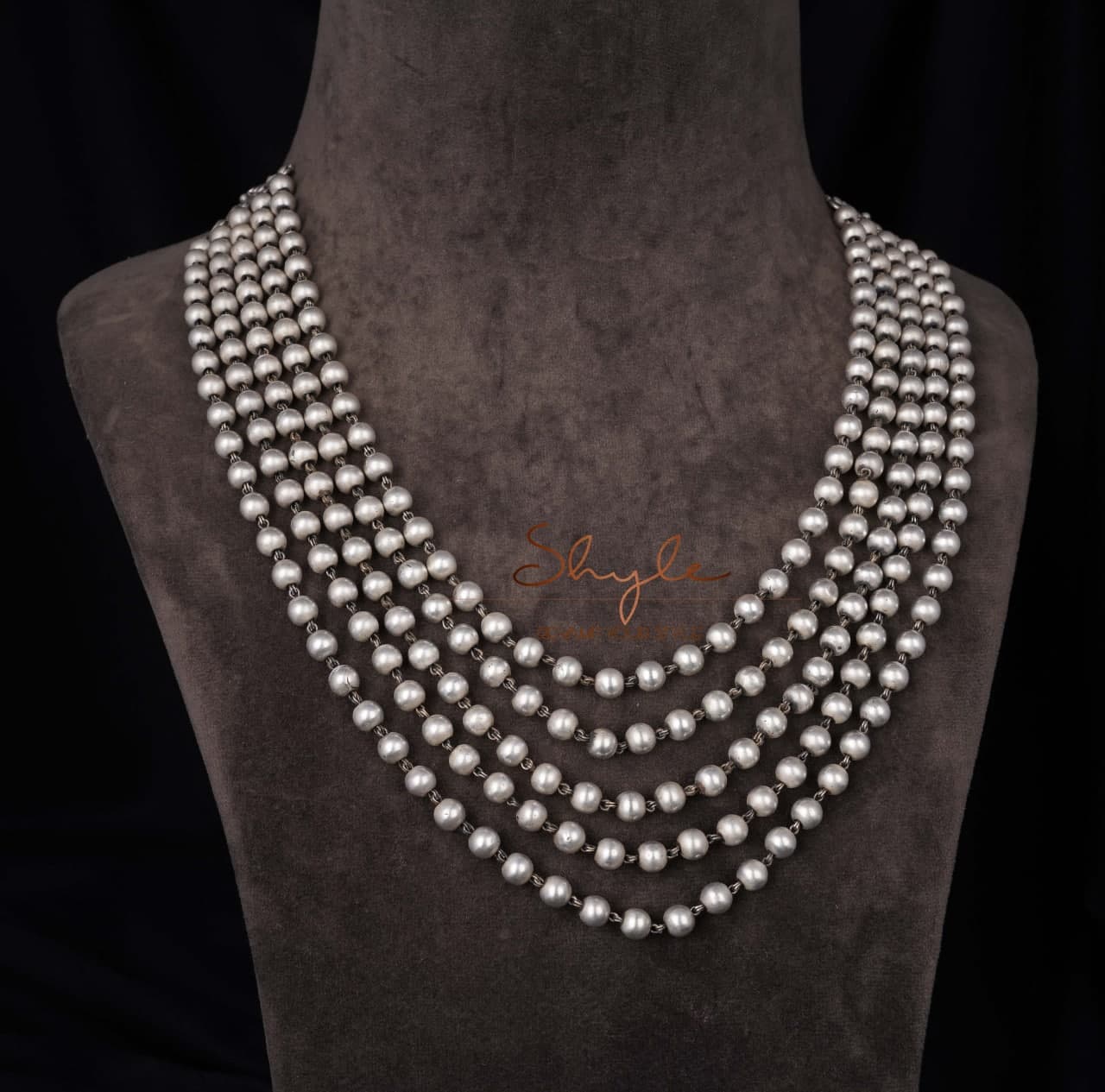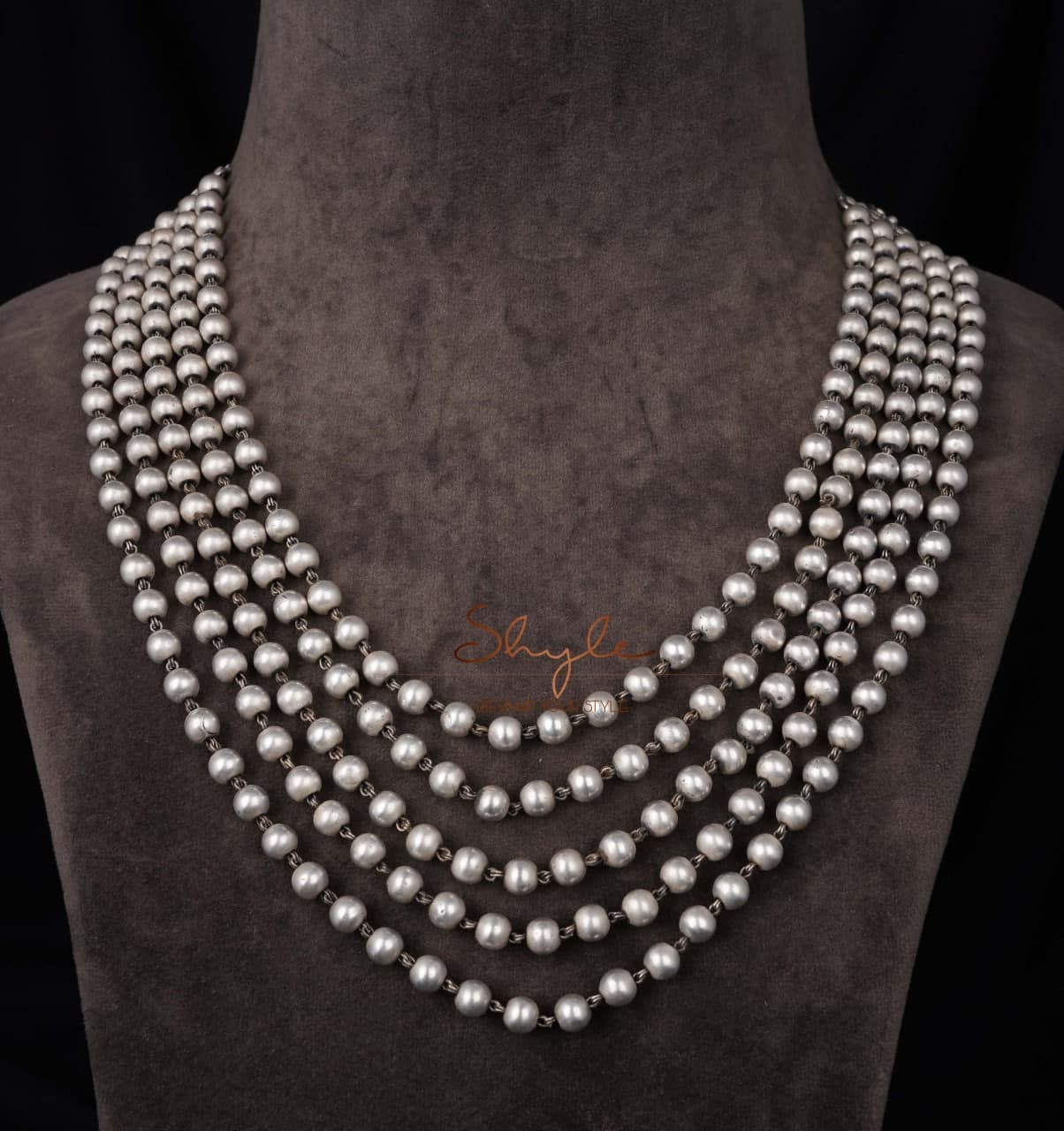 When tradition creates drama, our Tattva necklace cascades in magnificent layers of perfectly crafted silver spheres. Five graduated strands create breathtaking dimension, while tribal inspired spacer beads add cultural depth to this statement masterpiece. The polished silver balls catch light from every angle, creating a mesmerizing waterfall effect that transforms simple elegance into show stopping glamour. "Tattva" meaning essence, this necklace captures the bold spirit of layered luxury that makes every occasion unforgettable.