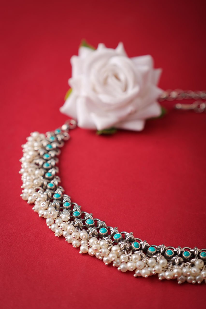 THE SHYLE TIP : Layer it over simple black tops and structured jackets for evening galas to let the turquoise and pearls steal the spotlight, or pair it with rich silk lehengas and heavy kurtas during weddings where you want to channel that perfect princess energy - this necklace transforms any outfit into a celebration of timeless Indian craftsmanship and royal elegance.