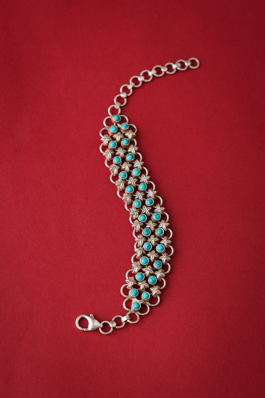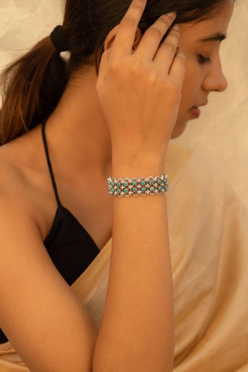 The Tattva Turquoise Jadau Timeless Two Layer Bracelet showcases intricate jadau (inlaid) designs with turquoise stones across two layered motifs that gleam with a vibrant hue, crafted through masterful craftsmanship. Inspired by the timeless allure of gemstone artistry, each detailed element blends striking elegance with enduring strength, creating a piece that feels both timeless and exquisitely modern. Made from premium materials, it’s perfect for formal wear.