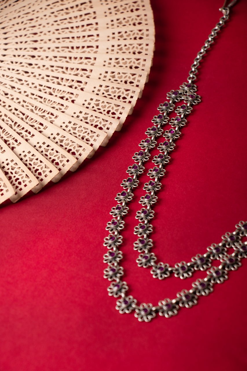 This elegant two layered necklace features beautifully carved flower motifs that create a continuous pattern of blooming elegance, with each layer gracefully complementing the other to form a harmonious cascade of floral artistry. Inspired by the eternal gardens of Mughal architecture where flowers represented paradise and prosperity, this piece captures the essence of blooming meadows translated into wearable art, celebrating the timeless connection between nature's beauty and human craftsmanship that has adorned women for centuries.